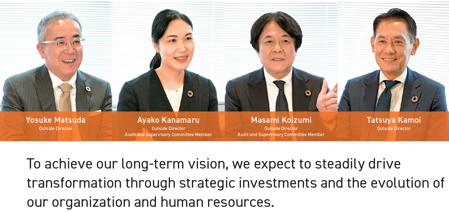 At Board of Directors meetings, regular reports are given on the progress of the Medium-term Business Plan, and Outside Directors are also given the opportunity to express their candid opinions. The management team takes such feedback and suggestions from Outside Directors seriously. Going forward, I hope to continue the highly transparent disclosure of information while making the relationship between each strategy clear.