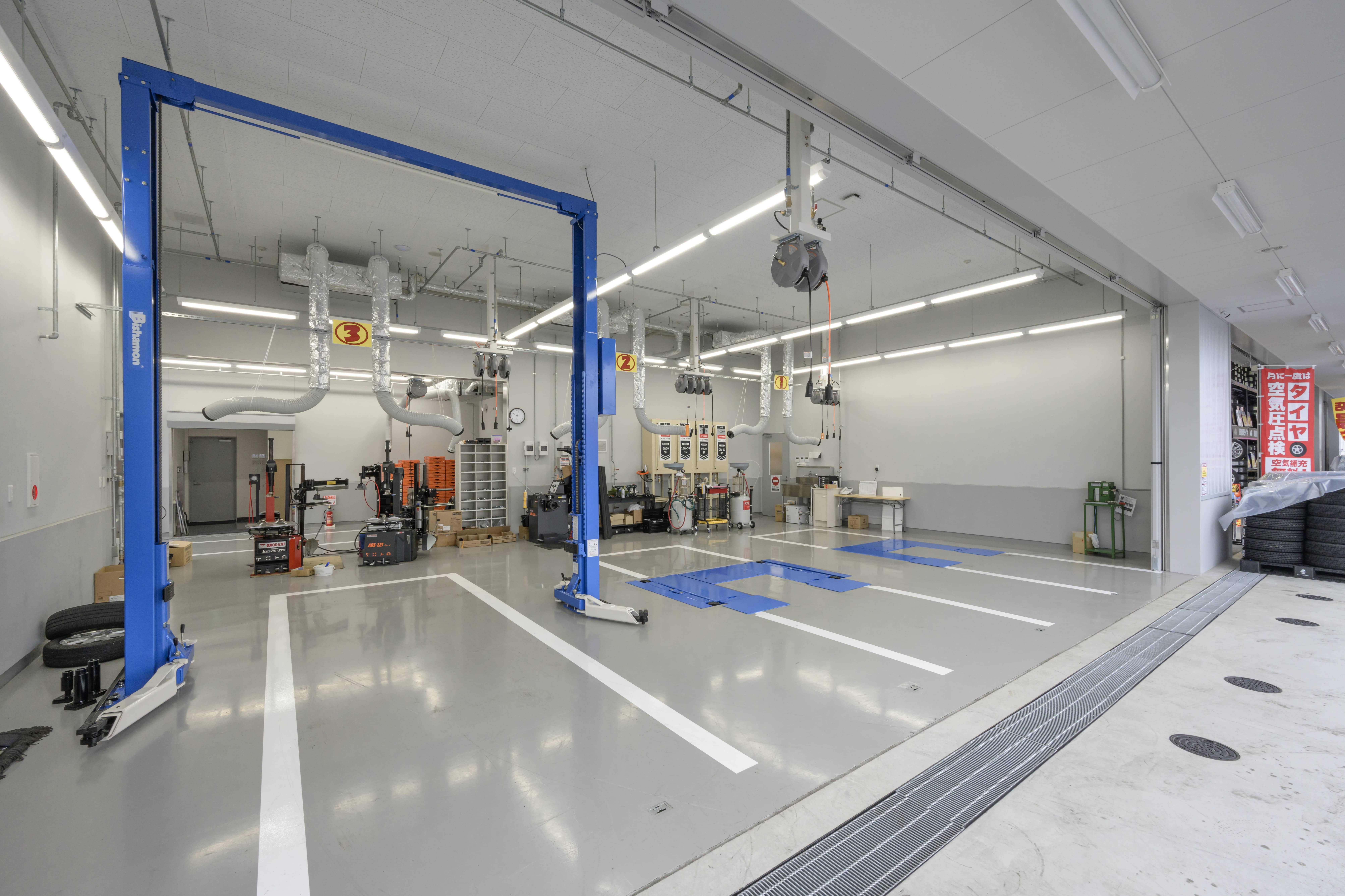 売場と整備工場が連続する空間の大開口部が印象的である。