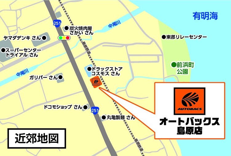 店舗は、島原鉄道・島原駅の北約2.0km、国道251号線沿いに位置します。タイヤ、オイル、バッテリーをはじめとしたカー用品に加え、カーライフの楽しさを提案する幅広い商品や、車検・整備などのサービスを展開いたします。自動車整備に関する知識と技術、提案力を備え、安心してクルマのメンテナンスをお任せいただける店舗として地域のお客様を全力でサポートいたします。