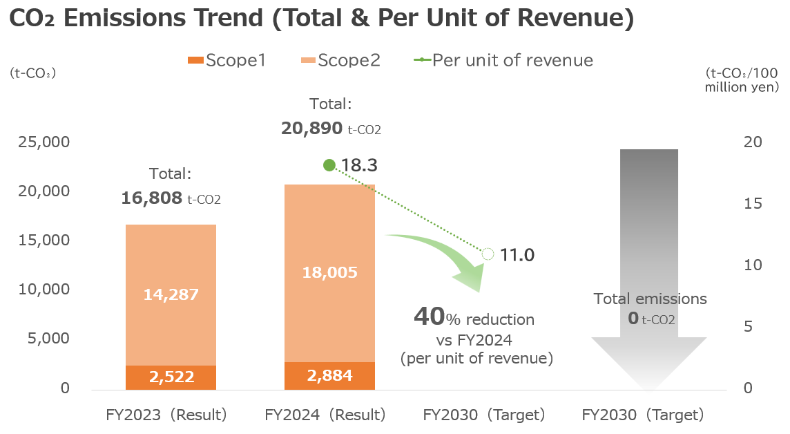 We are working to reduce greenhouse gas emissions with the goal of creating a safe, secure, and inclusive society where people, cars, and the environment coexist in harmony. Our reduction target is to cut CO₂ emissions per ¥100 million in sales revenue by 40% compared to FY2024, to 11.0 (t-CO2/100 million yen) by FY2030. In FY2024, CO2 emissions per 100 million yen in sales were 18.3 (t-CO2/100 million yen). Furthermore, in line with the Japanese governmentʼs declaration, we are advancing initiatives to achieve carbon neutrality (net-zero emissions) by FY2050.