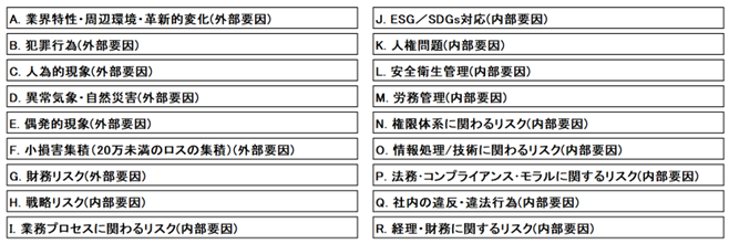 リスク評価プロセス当社のリスク評価は、18のリスクカテゴリーにおける177のリスク項目について、経営層および管理職によりリスクマップに基づき分析・評価を行っております。毎年、この評価結果と過年度の重点リスク項目のモニタリング結果を基に「リスクマネジメント委員会」でレビューし、翌期の重点リスク項目を選定しリスク管理に取り組んでおります。