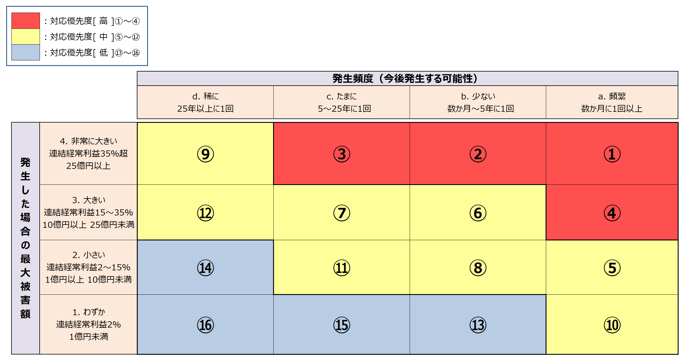 ※リスクマップの最大被害額および発生頻度の基準数値は分析・評価のために設定した目安であり、実態を反映 したものではありません。