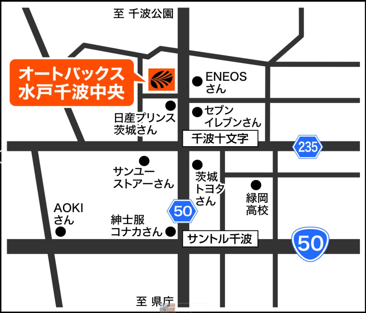 店舗は千波公園から南に約2Km、県道50号沿いに位置します。タイヤ、オイル、バッテリーをはじめとしたカー用品に加え、車検・整備などのサービスを展開いたします。自動車整備に関する知識と技術、提案力を備え、安心してクルマのメンテナンスをお任せいただける店舗として地域のお客様を全力でサポートいたします。